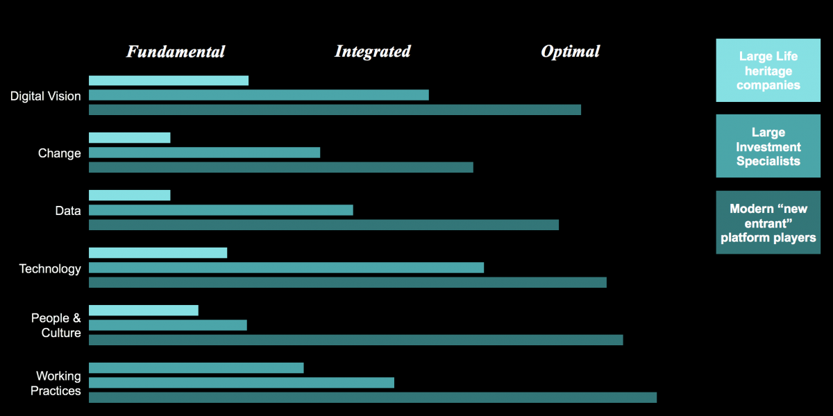 Large life heritage companies trail new entrants significantly in all departments. Looking at Data as an example, it’s an area in which the large heritage firms cannot be expected to match their lighter counterparts – systems built 10-20 years ago simply weren’t designed to capture and exploit the information that is available now.